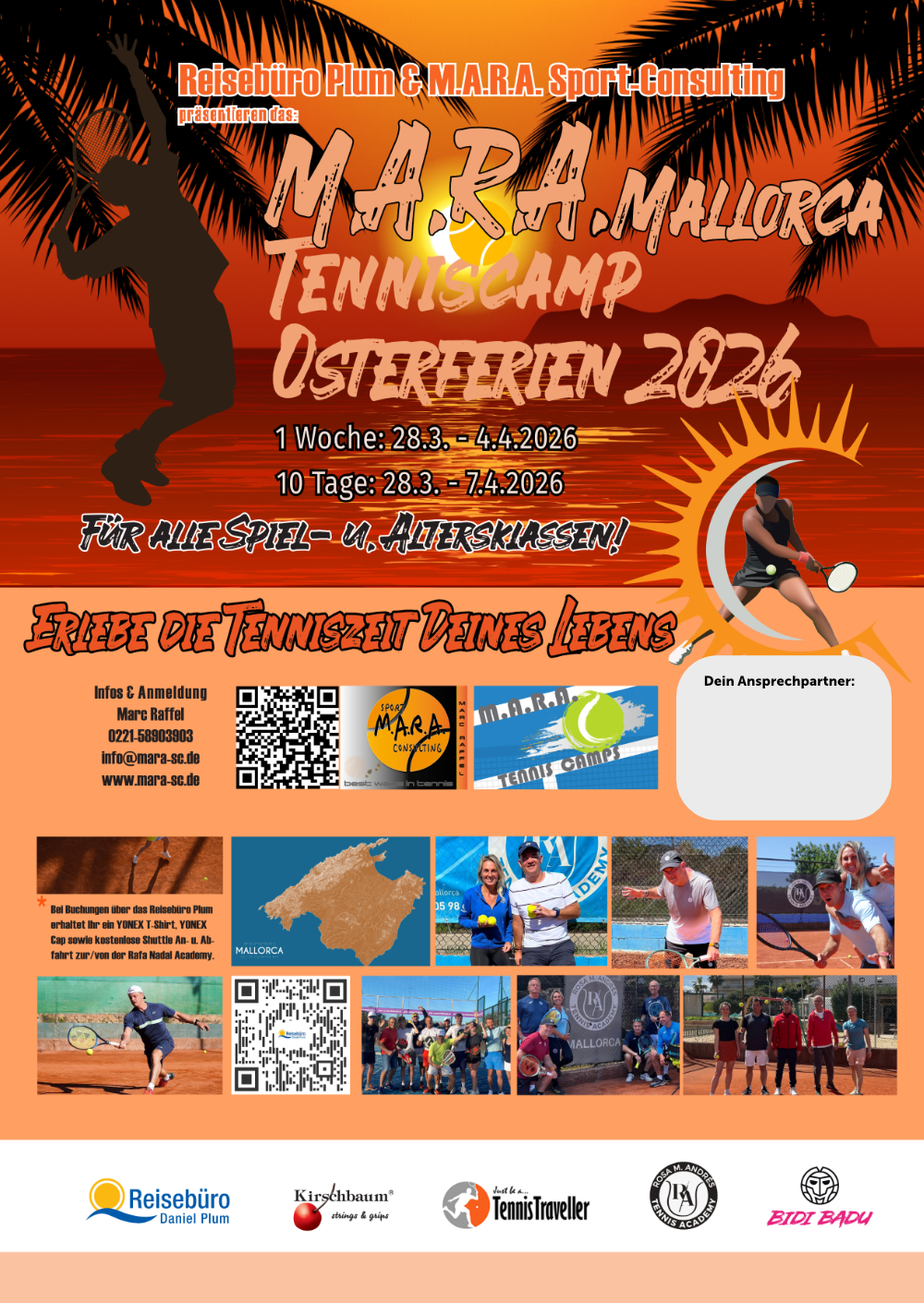 Seit über 25 Jahren steht das M.A.R.A. Tenniscamp für Tradition, Qualität und Erfahrung aus einer Hand. Marc Raffel, Diplom Sportlehrer und DTB A-Trainer, bietet gemeinsam mit seinem erfahrenen Team in den kommenden Osterferien 2026 vom 28. März bis 4. April (1 Woche) bzw. 28. März bis 7. April 2026 (10 Tage) wieder das erfolgreiche Mallorca Tenniscamp in Cala Millor an.